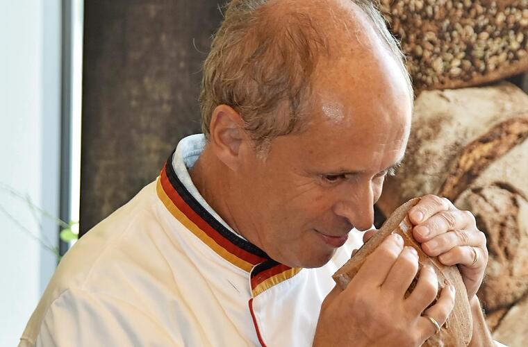 Sein Brotmesser gleitet durch den ersten Laib, ein 100-prozentiges Roggenbrot, für seinen Geschmack etwas zu hell gebacken. "Die Kruste ist relativ dünn, das Brot wurde zu kurz gebacken." Das gehe zulasten des Aromas und des Kaugenusses, obgleich der Geschmack gut sei, die Säure angenehm.