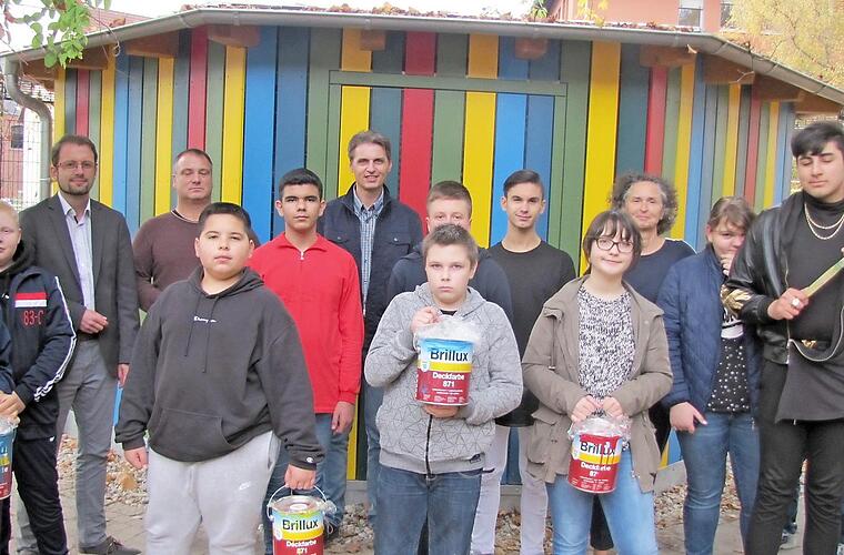 "Der Schulhof soll schöner werden!" Das sei der Anstoß für das Engagement gewesen, sagte die Lehrerin. Jetzt ist im Schulhof ein hölzernes Oktogon entstanden, das aus vielen bunten Elementen besteht. Die Hütte kann als Gerätehaus, als Umkleidekabine und etliche weitere Zwecke genutzt werden. Verkleidet ist die Hütte mit bunten Holzbrettern. Vorher standen standen an der Stelle einfach nur graue Betonklötze.