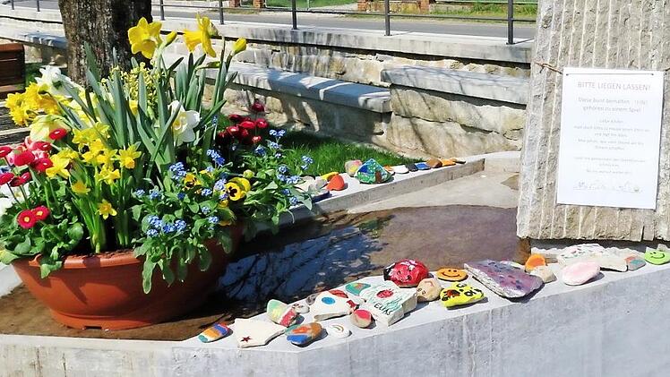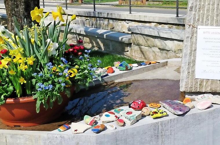 Am Brunnen in Stublang ist ein etwas anderer Osterschmuck zu sehen. Auf Initiative der Stublanger Jugendgruppe mit den Leiterinnen Moni Moritz-Ruppenstein und Lena Dinkel ist jedes Kind aufgefordert, zu Hause einen Stein bunt zu bemalen und ihn auf den Brunnenrand zu legen: "Lasst uns gemeinsam den Osterbrunnen schmücken. Mal sehen, wie viele Steine wir zu Ostern schaffen" heißt es in dem Aufruf. Foto: Monika Schütz