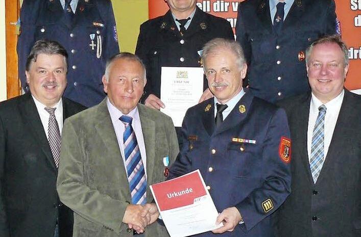 Untersteinach — Die Auszeichnung mit der Bayerischen Feuerwehr-Ehrenmedaille für Altbürgermeister Heinz Burges sowie die Ehrung von Werner Geier mit dem Staatlichen Ehrenzeichen in...