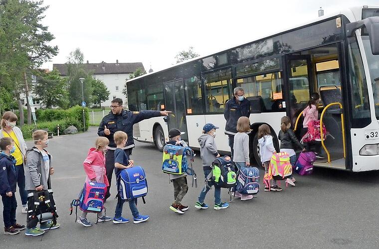 Damit die über 40 Erstklässler der Grundschule Stockheim im kommenden Schuljahr sicher zum Unterricht und wieder nach Hause kommen, lernen sie bereits vorab, wie sie sich beim Umgang mit dem Schulbus verhalten müssen.