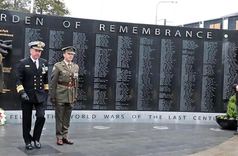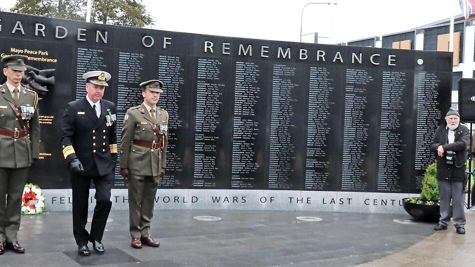 Besondere Ehrengäste waren am Sonntag Vizeadmiral Mark Mellett, gebürtiger Castlebarer und Unterstützer des Peace Park, der als Kommandant die Ehrenformation der "Irish Defence Force" (irische Streitkräfte) abnahm. Anschließend wurden feierlich eine Plakette enthüllt und viele Kränze am Mahnmal niedergelegt.
