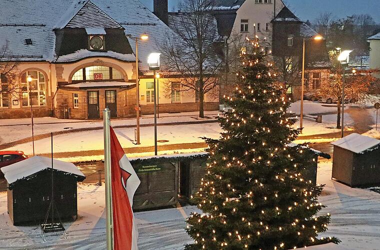 Seit Montag leuchten die von einer externen Firma angebrachten Lichterketten an der Nordmanntanne auf dem Bahnhofsplatz und an den Bäumen drum herum. Vorige Woche haben Bauhofmitarbeiter bereits die ersten Weihnachtsmarkt-Hütten platziert. Vom 11. bis 14. Dezember wird vor dem Rathaus mit dem Sonneberger Christkind das Fest eingeläutet, heißt es in der Mitteilung. red