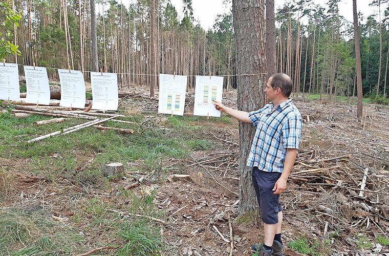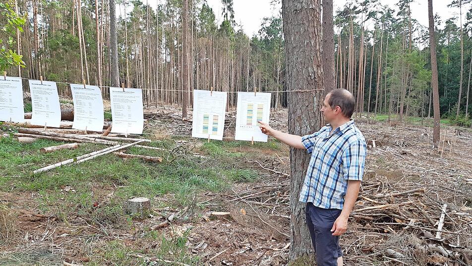 Anhand der Schulungsfläche im Seßlacher Stadtteil Autenhausen führte Revierleiter Markus Fröba beispielhaft vor, wie eine Wiederbewaldung aussehen könnte. Zunächst erläuterte er zusammen mit WBV-Geschäftsführer Manfred Herter die örtlichen Gegebenheiten: Auf einer Teilfläche sorgen Kiefern für eine geringe Beschirmung, die zweite ist durch Kahlschlag gekennzeichnet, auf beiden standen vorher Fichten. Der Boden ist insgesamt lehmig mit mittlerer Basenausstattung.