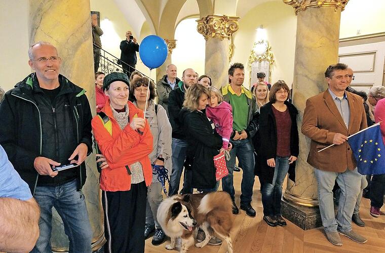 Am Sonntag fand zum sechsten Mal eine Kundgebung für Europa als Teil der Bewegung "Pulse of Europe" statt. Etwa 80 Bürger sind aufgrund des starken Regens spontan vom Marktplatz in das Foyer des Coburger Rathauses ausgewichen.