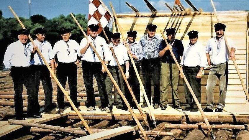 Nach etwa 20 Jahren war erstmals wieder ein richtiges Floß auf dem Rhein zu sehen. Dass diese heute mit dem Hauch der Nostalgie behafteten hölzernen Gefährte einst zum vertrauten Bild gehörten, war zum Zeitpunkt der Jubiläumsfeierlichkeiten nur noch den Älteren geläufig.