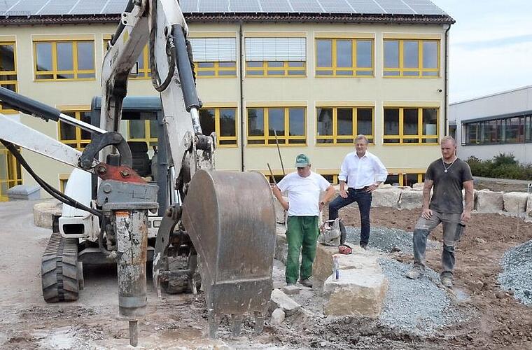 Es wird sehr viel Sandstein, Kies und Grauwacke, aber auch Holz verwendet und dazu auf eine blütenreiche Aussaat wertgelegt, die den Pausenhof in ein buntes Naturareal verwandeln wird. Die Kosten für die Neugestaltung beziffert Bürgermeister Detsch auf circa 40 000 Euro.