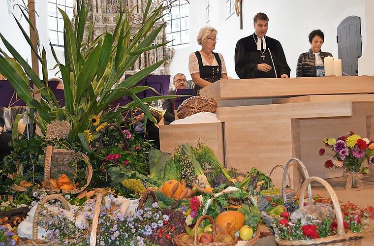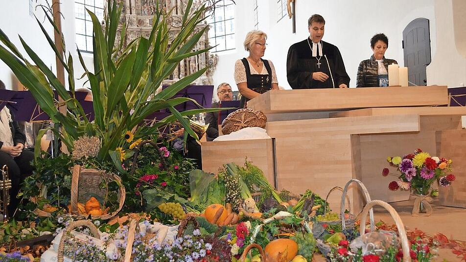 Möhren, Kohlköpfe, Kürbisse und mehr Erntegaben von Garten und Feld hatten die Landfrauen liebevoll vorm Altarraum in der Coburger Morizkirche drapiert. Die Sängerinnen vom Landfrauenchor steuerten Körbe mit bunten Blumen und Früchten bei.