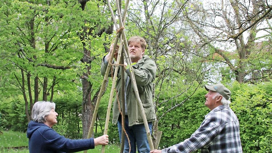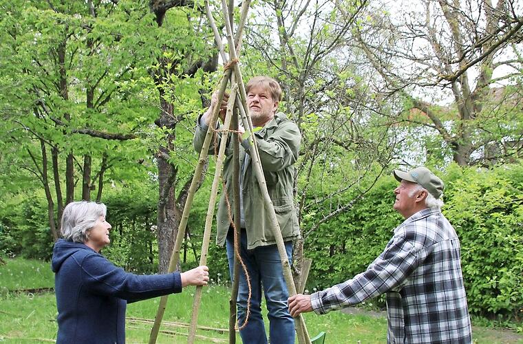 Denn darum geht es. Die Bienen, die wieder im alten Bienenhaus des Novizengartens eingezogen sind, brauchen die ganze Saison über Nahrung. Deshalb haben die Helfer nun auch Feuerbohnen gezogen, die sie auspflanzen wollen, sobald es die Witterung zulässt. Jetzt haben sie dafür Rankhilfen gebaut. "Die Bohnen blühen sehr lange", sagt Hans Petsch.