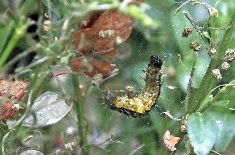 Sowohl bei Dieter Kolb, Willhelm Nährig und auch bei Reinhardt Grasse hat der Schädling bereits gewütet. Und bei allen Dreien zeichnet sich dasselbe Bild ab: Befallene Pflanzen in einem beige-gelblichen Farbton, kaum noch Blätter und häufig von den Raupen eingesponnen.