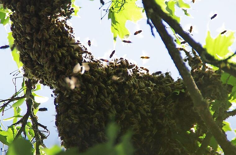 Imker Thorsten Hugel wurde zu Hilfe gerufen, um die Bienen aus fünf Metern Höhe aus einer Baumkrone zu holen. Dort hatte der Schwarm einen Stopp eingelegt. Der Fachmann erklärte auf unsere Nachfrage, dass das Schwärmen dann eintritt, wenn eine neue Königin schlüpft. Die alte Königin macht sich zu dieser Zeit auf die Suche nach einem neuen Stock, "mit ungefähr der Hälfte der Bienen und 20 Kilo Honig in den Bäuchen".