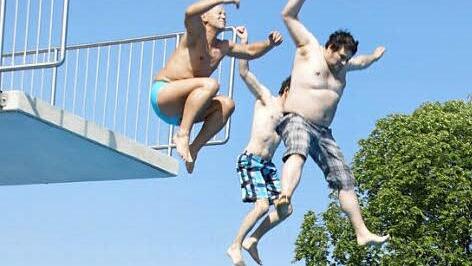 Schüler, Jugendliche und Erwachsene zeigten klassische "Arschbomben", auch Sprünge mit Überschlag und Drehungen - und manche Oberschenkel-, Rücken- oder Bauchklatscher, die für farbliche Veränderungen auf der Haut sorgten, die nicht auf die Sonneneinstrahlung zurückzuführen waren. Einige wenige Mädchen waren am Start, bei den Erwachsenen waren die Männer unter sich.