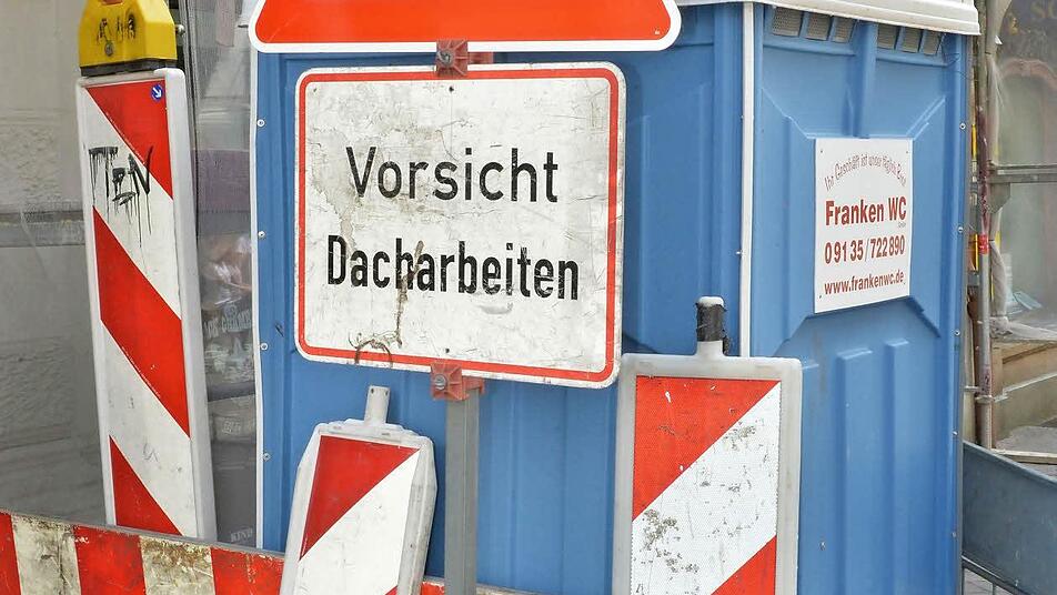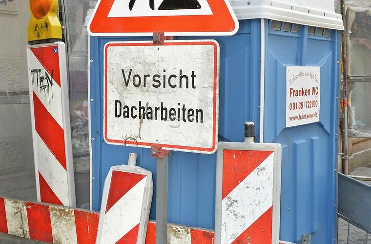Baustellen, überall Baustellen. Bamberg ist so eine wunderbare Stadt, aber manchmal beschleicht einen das Gefühl, dass sie hinter den vielen Baustellen verschwindet. Und so lässt sich leicht glauben, was dieses Bild aus der Langen Straße suggeriert: Die Baustellen-Klos werden selbst zur Baustelle und erzwingen Arbeiten an ihrem Dach. Sollte es wirklich so sein, sei den Bauarbeitern zur Ablenkung vom Geruch dringend Musik empfohlen, Dixie-Musik natürlich.