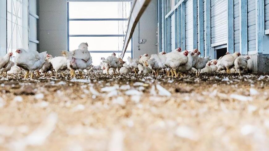 Nach rund 21 Tagen werden die Küken in den etwa 900 Quadratmeter großen Maststall gebracht. Auf frischer Einstreu und einer kurzen Eingewöhnungsphase dürfen die Hähnchen dann auch durch Auslaufklappen in den Außenbereich. Herbert Hanna nennt ihn schlicht Wintergarten. Denn durch Windschutznetze ist das Geflügel auch hier vor Sturm und Regen geschützt und trocken eingestreut. In diesem Bereich befinden sich auch Sandbäder für die Pflege der Gefieder.