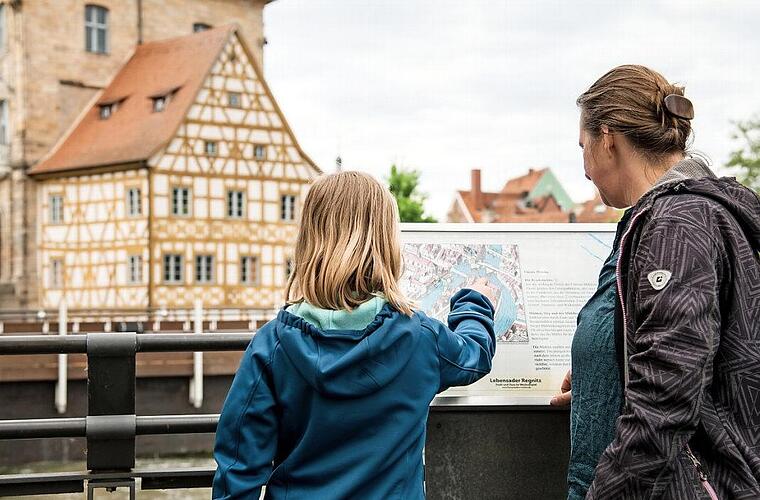 Mit dem Flusspfad Bamberg eröffnen sich Abenteuer für Familien mit Kindern. Selbst Kaiserin Kunigunde spricht mit den Kleinen.