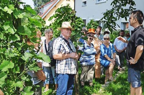 Die Teilnehmer begaben sich auf eine Wanderung in die nahe gelegenen Weinberge der Lage "Oberschwappacher Sommertal". Bei einem Zwischenstopp am Weinlehrpfad mitten im Ort begeisterte Udo Vogt die Teilnehmer mit der Staberziehung eines Rebstocks. Diese Form der Behandlung ist im Vergleich zur waagerechten Rebstockerziehung, wie sie sonst in den Weinbergen oder auch am Haus üblich ist, sehr einfach und praktisch für jeden Garten geeignet.