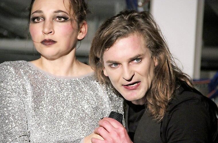 Ja, die leer geräumte Lagerhalle der Fa. upjers bietet Platz für ca. 100 Zuschauer. Und dem Ensemble Raum sich zu entfalten. Mit einer stufenartig aufgebauten Bühne (David Grimm), mit Videoeinspielung (von der Villa-Concordia-Stipendiatin Janis Rafa), mit einer One-Man- Band (Jakob Fischer) im Hintergrund. Da kann schon einmal Ophelia (Aline Joers) hinter der mit Plastikplanen verhängten Bühne zum Spurt rund ums Publikum starten, im finalen Showdown kreuzen Hamlet (Felix Pielmeier) und Laertes (Martin Habermeyer) gekonnt die Klingen, der Totengräber kriecht unter einem Bühnenelement hervor.