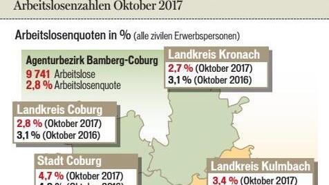"Die Arbeitslosenquote verringerte sich im abgelaufenen Monat um 0,3 Prozentpunkte auf 2,8 Prozent (Vorjahr 3,1 Prozent). Damit herrscht im gesamten Agenturbezirk Vollbeschäftigung. "Die Konjunktur ist weiterhin im Aufwind. Eine frische Brise bescherte uns einen fortwährenden Herbstaufschwung in den vergangenen beiden Monaten. Der Jobmotor dreht weiterhin auf Hochtouren. Der Stellenbestand ist seit Jahresbeginn im Durchschnitt um gut ein Drittel größer als im letzten Jahr. Die Zahl der Arbeitslosen liegt deutlich unter der von 2016. Seit letztem Jahr stieg die Zahl der sozialversicherungspflichtig Beschäftigten im Agenturbezirk um über 5400 auf insgesamt 237 000", erklärt Brigitte Glos, Leiterin der Agentur für Arbeit Bamberg-Coburg, die Lage auf dem Arbeitsmarkt.