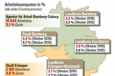 Im Oktober 2016 ist die Arbeitslosigkeit im Agenturbezirk Bamberg-Coburg weiter zurückgegangen, und zwar auf 10 544. Die Arbeitslosenquote beträgt 3,1 Prozent. Das ist die niedrigste Arbeitslosigkeit seit 1980. Im September waren noch 11 675 Menschen arbeitslos gemeldet.