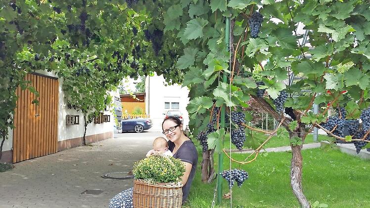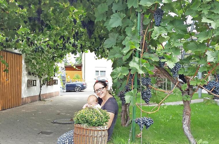 Voller Geigen kann der Himmel schon mal hängen, wenn man verliebt ist. Ganz sicher hängt der Himmel jetzt aber voller Trauben in der Sandgasse in Sand bei Familie Ullrich. Hier genießen die Besucher der Heckenwirtschaft nicht minder: Denn ab und zu wandert eine der Beeren von den großen Träubeln in den Mund. Familie Ullrich hat schon vor Jahren den schönen Rebengang hin zur Heckenwirtschaft "Beim klanna Basso" angelegt. Schon der Vater Edwin, der "Basso", pflanzte und pflegte die Reben. Eine an der Pergola ist schon sehr alt und wird durch den Sohn Sven weiter liebevoll gepflegt. Der Weinbau läuft hier im Nebenerwerb. Für unser Foto hat Svens Gattin Tanja mit Töchterchen Mila Platz am Rebengang genommen. Die Kleine ist gerade ein Vierteljahr alt. Wenn sie und ihr Bruder, der vierjährige Liam, einmal groß sind, dürfte dieser Laubengang noch prächtiger und sicherlich eine besondere Attraktion sein. Foto: Brigitte Krause