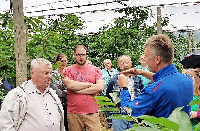 Christoph Vogel informierte die 32 Hobbygärtner unter der Leitung von Kreisvorsitzendem Fritz Pohl und Kreisfachberaterin Beate Singhartinger über die Bedeutung der Anlage. Aktuell arbeite man, so Vogel, an der Optimierung des modernen Kirschenanbaus. Insbesondere berücksichtige man die speziellen Klima- und Anbaubedingungen. Mittlerweile sei der kleinwüchsige Kirschbaum ein Erfolgsmodell geworden.