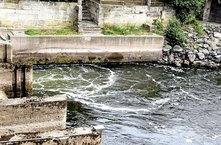Nur noch 30 Kilowatt leistet eine der beiden Turbinen, die zusammen bis zu 280 Kilowatt in das Stromnetz einspeisen können. In den Jahren 2011 und 2013 wurden die Generatoren und Getriebe erneuert, die, heute geräuscharm, nicht mehr die Anwohner belästigen. Rund 14 Kubikmeter Wasser in der Sekunde treiben die Turbinenschaufeln normalerweise an. Derzeit fließen nur etwa zwei Kubikmeter pro Sekunde durch die verstellbaren Leitschaufeln. Ansonsten würde der Stauspiegel im Oberwasser sinken. Am städtischen Flussbad würde dann nur noch ein Rinnsal vorbeifließen.
