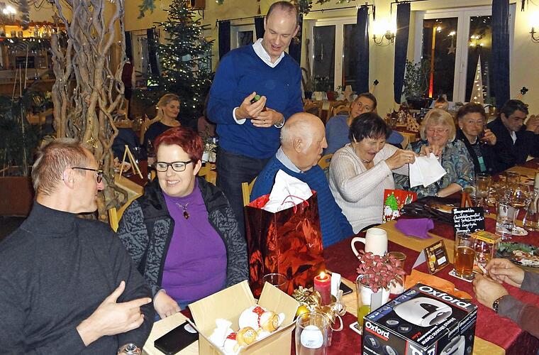 Das Los bestimmt wieder, wer als nächster dran ist. Statt ein neues Geschenk auszusuchen, kann dieser ein bereits ausgepacktes stehlen und der Beraubte hat die Möglichkeit, sich entweder etwas Neues zu holen oder einem dritten Gast sein Gut zu entwenden. Es wurde ein spannendes Tauschen und Rauben, bis alle Geschenke einen Besitzer hatten. Vorsicht: Man sollte sich nie sicher sein, dass man das ausgesuchte Geschenk behalten kann, denn ehe man sich's versieht, ist es schon geklaut! "Man könnte so ein Stück auch einen Kurzzeitgewinn nennen", meinte einer der Gäste passend. Und was es alles für Gewinne gab: ein Ultraschallgerät, mit dem man Brillen, Schmuck und Uhren reinigen kann, ein heiß begehrtes Rotkehlchenkissen, ein Rückenkratzer, diverse Teelichter und Kerzen, kitschige Weihnachtsdeko, ein Radiogerät mit Lautsprechern, Handtaschen ... alles war vertreten. Immer wieder hörte man staunende Ohs und Ahs, wenn ein neuer "White Elephant" ausgepackt wurde.