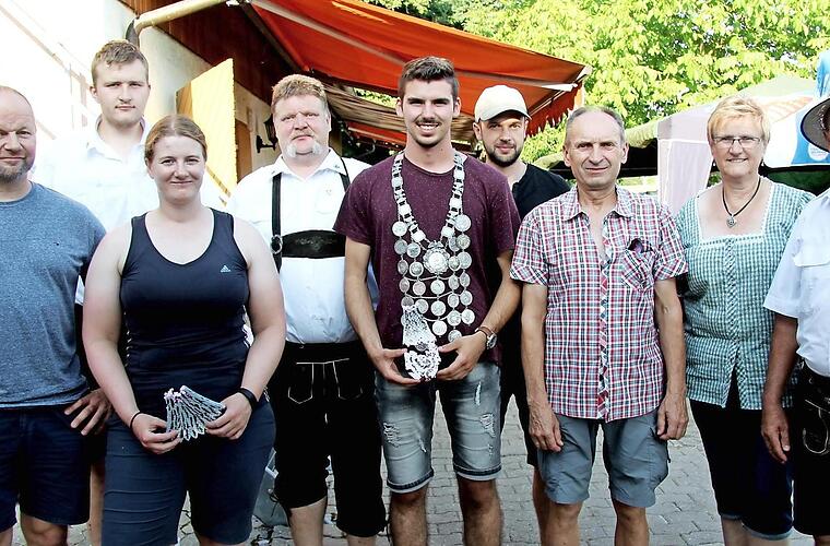 Aber dann wurde es wieder etwas zäh, schließlich fiel bei Sonja Ackermann der Steiß. Der Korpus wackelte zwar in der Folge immer wieder, wollte aber nicht fallen. Schließlich Beifall und Glückwünsche für Maximilian Büchel, dem der Vorsitzende dann die Kette umlegte und ihn beauftragte, den Schützenverein auch würdig zu vertreten.