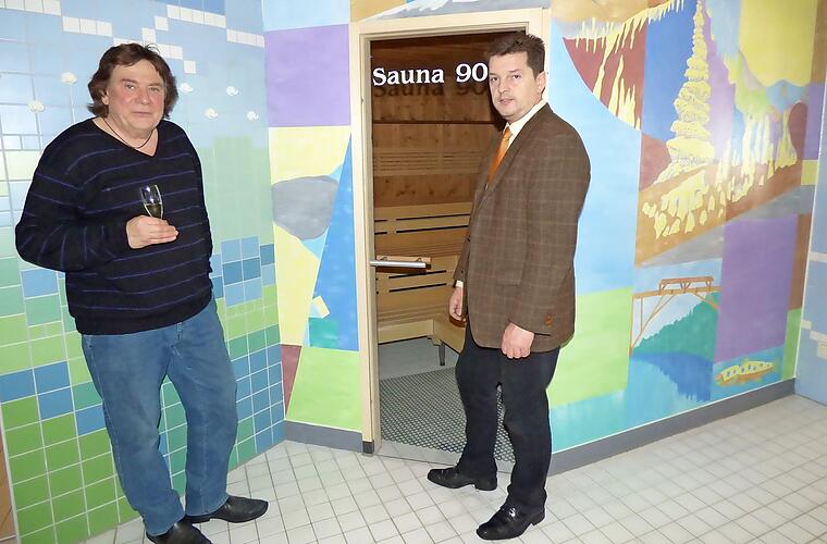 Auffällig an der Wandgestaltung sind vor allem die Kunstwerke des bildenden Künstlers Heinz Volk aus Ebersdorf in der Marktgemeinde Dietenhofen, von dem bereits viele Kunstwerke in Pottenstein zu finden sind. Ziel sei es gewesen, erklärt Volk, der die letzten drei Monate ununterbrochen daran gearbeitet hatte, die Farben zum Klingen und Schwingen zu bringen. An den Wänden sollte dadurch eine sanfte, sahnige Wirkung der Farben, die ineinander verlaufen, erreicht werden. Gearbeitet hat er unter anderem mit atmungsaktiven Silikatfarben, die gegen Schimmelbefall und gut für die Luftfeuchtigkeit in einer Sauna sind.