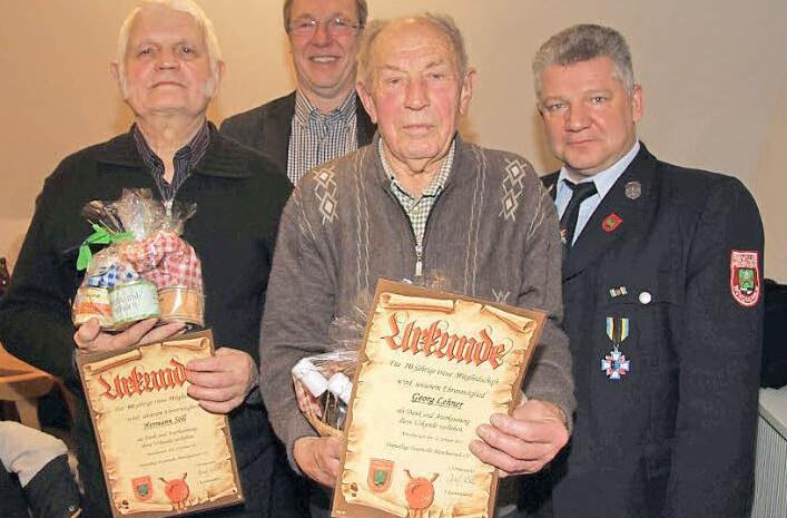 Vorsitzender Josef Schaub und Bürgermeister Klaus Schumann konnten an Georg Lehner eine Urkunde für die 70-jährige Mitgliedschaft überreichen, "das ist einmalig in der Geschichte unserer Feuerwehr", erklärte der Vorsitzende und für die 60-jährige Mitgliedschaft gab es auch für Hermann Söll eine Urkunde und Dankesworte.