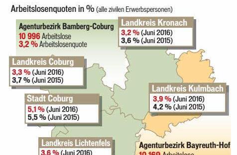 Die Zahl der Arbeitslosen reduzierte sich im Landkreis Kronach gegenüber dem Vormonat um 17 Personen oder 1,4 Prozent. Ende Juni gab es 1221 Menschen ohne Job. Gegenüber dem Vorjahresmonat verringerte sich diese Zahl um 154 bzw. 11,2 Prozent. Das ist mit dem Landkreis Coburg der größte Rückgang unter allen Kreisen im Agenturbezirk. Die Arbeitslosenquote lag im Berichtsmonat, ebenso wie im Mai bei 3,2 Prozent (Vorjahr 3,6 Prozent).