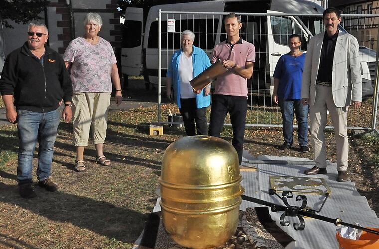 Am Dienstag wurde die neu vergoldete Turmkugel samt der Wetterfahne von der Firma Elsner aus Großwalbur-Meeder bei Coburg auf dem sogenannten "Kaiserstiel" auf der Turmspitze befestigt. In der Turmspitze befindet sich ebenfalls ein Kupferbehälter mit historischen Dokumenten. Das älteste davon ist ein Bericht aus dem Jahr 1735 über die Feier zum 200. Jubiläum der Kirche im Jahr 1730. Es ist daher anzunehmen, dass die Kirche in ihrer heutigen Form im Jahr 1530 vollendet wurde.