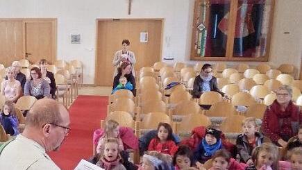 Mit Eifer sangen die Kinder des Kindergartens St. Martin in Sand beim Kindergottesdienst zum Erntedankfest im Pfarrsaal mit. Diakon Bernhard Trunk gestaltete die Feier. Die Kinder dankten für Obst, Gemüse und Brot. Einen Dank für die Mamas, Papas und die tollen Großeltern gab es auch. Auf dem Rückweg zum Kindergarten ging es in die Kirche, die saniert wird. Mit großen Augen bestaunten nicht nur die Kinder den Umbau. Foto: Bruno Baum