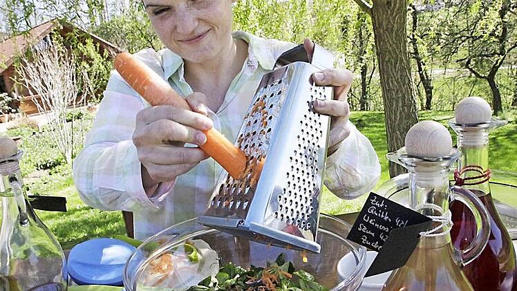 Rapunzel und viele Blumen Grundlage des Wildkräutersalates, den Carola zaubert, ist selbst gepflückter Rapunzelsalat. Hinzu kommen Blätter und Blüten vom Löwenzahn, Taubnessel, Gänseblümchen, der "Fleischblume", die gegen Frühjahrsmüdigkeit hilft, Veilchen und nicht zu vergessen der Giersch. Um die Farbenpracht zu vervollständigen, raspelt die Kräuterfee nach Gusto noch etwas von einer Karotte hinzu. Zum Geschmackserlebnis wird der Salat aber erst durch den selbst angesetzten Brombeeressig von Andrea Schmitt.