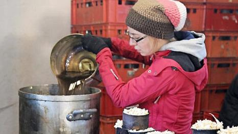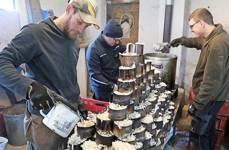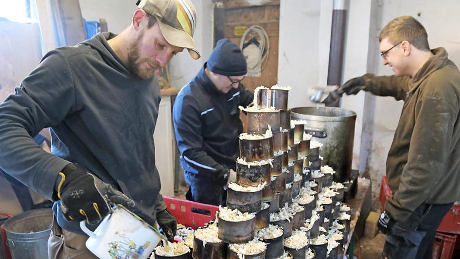 Jetzt haben die Akteure eine Art Fertigungsstraße in der Werkstatt aufgebaut, schließlich müssen die Arbeitsvorgänge Hand in Hand gehen. Zunächst zerkleinert eine Gruppe die Kerzenreste in möglichst kleine Teile. Das beschleunigt den Schmelzvorgang in den mit Gas von unten befeuerten Behältern erheblich. Daneben stehen in großen Säcken Hobelspäne bereit, die fleißige Hände in flache leere Wurstdosen einfüllen.