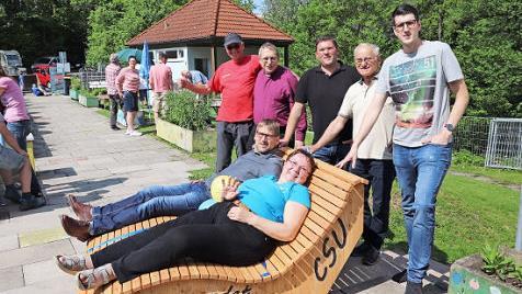 Gemeinsam probierten Vertreter der CSU Weißenbrunn die den Schwimmbadfreunden gespendete Schwungliege im Freibad aus. Über die neue Attraktion freuen sich (von links, stehend) Axel Witthauer (Zweiter ...