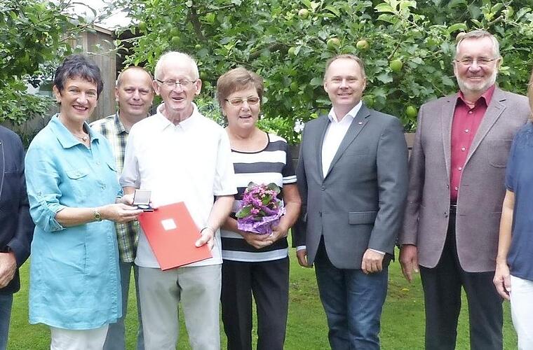 "Manfred Riedel verkörpert in besonderer Weise unsere sozialdemokratischen Ideale Freiheit, Gerechtigkeit und Solidarität. Deine Verbundenheit mit unseren Werten und Deine Verdienste um die Partei sind beispielhaft. Die Sozialdemokratische Partei Deutschlands spricht Dir, Manfred Riedel, dafür Dank und Anerkennung aus und verleiht Dir auf Antrag des SPD-Ortsvereins die Gedenkmedaille Willy Brandt. Wir sind stolz, Dich in unserer Mitte zu wissen. Du hast all die Jahre gerne eine wertvolle und wichtige Arbeit für Deine Heimatgemeinde und die Entwicklung Himmelkrons geleistet", betonte Inge Aures und überreichte im gepflegten Garten der Familie Riedel unter dem zustimmenden Beifall der Gäste die SPD-Urkunde und Medaille.