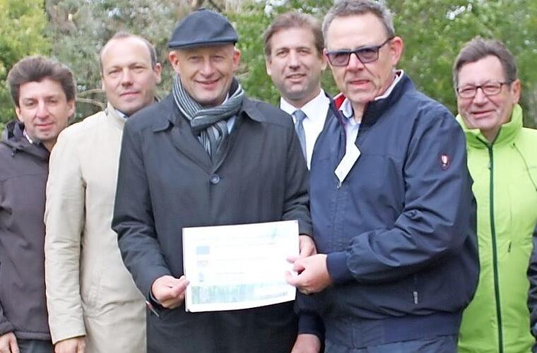 Der Vorsitzende des Landschaftspflegeverbandes Forchheim, Claus Schwarzmann, hat am Pretzfelder Wehr den Förderbescheid des Leader-Projekts "Verbesserung der Laichsituation der Wiesentforelle" von Klaus Schiffer-Weigand überreicht bekommen.