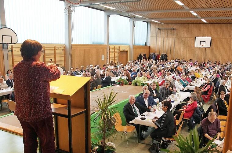 Mit den Liedern "Hab' Sonne im Herzen" und "Schenk ein Lächeln" leitete der Chor perfekt zum Thema der Referentin über. Das Thema der freien Journalistin, Logotherapeutin und Theologin Ursula Lux lautete: "Das Leben ist viel zu kurz für ein langes Gesicht." Als ersten Ratschlag gab sie: "Lächle doch einfach über das, was nicht zu ändern ist." Humor sei für die Lebensbewältigung wichtig, fuhr sie fort und erinnerte an Karl Valentin. Da die Deutschen wegen ihrer Humorlosigkeit verschrien seien, sollten die Franken auch an ihrem Humor arbeiten. "Was brauche ich?", fragte Lux dann und gab als Antwort: "Die Fähigkeit, zu mir selbst auf Abstand zu gehen". Papst Johannes XXIII habe zu sich selbst gesagt: "Giovanni, nimm dich selbst nicht so wichtig!" Wenn man die höchste Kunst des Humors beherrsche, über sich selbst zu lachen, können andere unsere Schwächen nicht mehr ausnutzen. Der Humor sei sehr individuell und so zwischen Franken und Ostfriesen oder Deutschen und Engländern sehr verschieden. Der Deutschen größtes Problem sei, 150 prozentig sein zu wollen. Lux empfahl also, etwas weniger Energie in die Perfektion zu stecken und diese lieber in den Humor zu investieren.