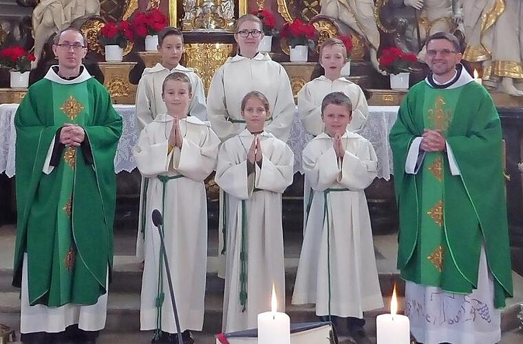 Als äußeres Zeichen hierfür erhielten Andreas Brütting, Lisa Feiler und Tobias Hobuß aus der Hand von Pfarrer Pater Flavian Michali, assistiert vom "Ministrantenpater" January Sliwa, das gesegnete Tau-Kreuz umgehängt und die Hostienschale überreicht. "Auch wenn es manchmal schwerfällt, so ist Ministrant sein doch auch ein Weg der Nachfolge", gab Pater Flaviden neuen Ministranten mit auf den Weg.