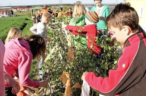 Bevor der Baum auf den Schultern der Feuerwehrleute aufs Gelände getragen wurde, hatten die Kinder der Schmetterlingsgruppe des OGV die Krone des Baumes mit bunten Bändern geschmückt.