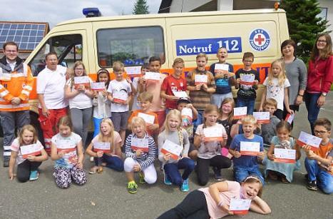 Mehrere Wochen lang hatten die Kinder unter Leitung von Förderlehrer Siegbert Jakob gelernt, wie man einem Verletzten helfen kann. Dazu zählten die stabile Seitenlage und das fachmännische Anlegen des Verbands. Auch übten die Jungen und Mädchen, wie man Verletzten Trost spenden kann und einen Notruf richtig absetzt.