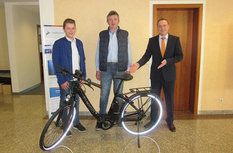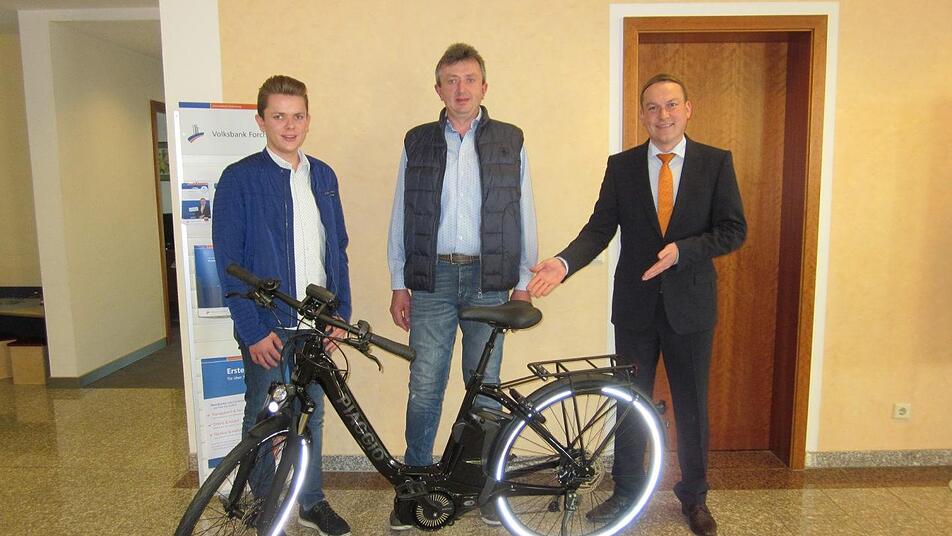 Agnes Spindler, Kundin der Volksbank Forchheim aus Leutenbach, hat beim Gewinnsparen einen der Hauptgewinne gewonnen: ein E-Bike im Wert von über 3000 Euro. Über den Gewinn freuen sich auch ihre drei Enkelkinder. Sie dürfen das Fahrrad künftig nutzen. Christian Hopfengärtner (rechts), Filialleiter der Volksbank in Pretzfeld, übergab das E-Bike an den Sohn und den Enkel der Gewinnerin. Foto: privat