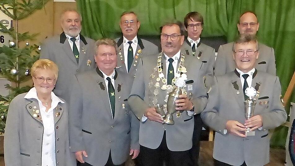 Vorsitzender Manfred Huhs rief Egon Barth zum neuen Herbstkönig der Schützengesellschaft Marktleugast aus, der mit einem 44,7-Teiler Rainer Gilke (81,4) und Gisela Schneider (125,8) hinter sich ließ.
