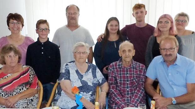 Hildegard und Emil Dresel aus Guttenberg feierten im Marktleugaster Senioren- und Pflegeheim ihre eiserne Hochzeit. Pfarrerin Heidrun Hemme gratulierte für die evangelische Kirchengemeinde Guttenberg zum seltenen Ehejubiläum. Die Glückwünsche der kleinen Frankenwaldgemeinde überbrachte Zweiter Bürgermeister Klaus Witzgall. Für den Landkreis Kulmbach gab sich stellvertretender Landrat Jörg Kunstmann ein Stelldichein. Er überreichte dem Jubelpaar zudem ein Glückwunschschreiben des bayerischen Ministerpräsidenten Markus Söder. Unser Bild zeigt Hildegard und Emil Dresel (sitzend, Mitte) mit Zweitem Bürgermeister Klaus Witzgall (rechts) im Kreise der Familie. Foto: Klaus-Peter Wulf