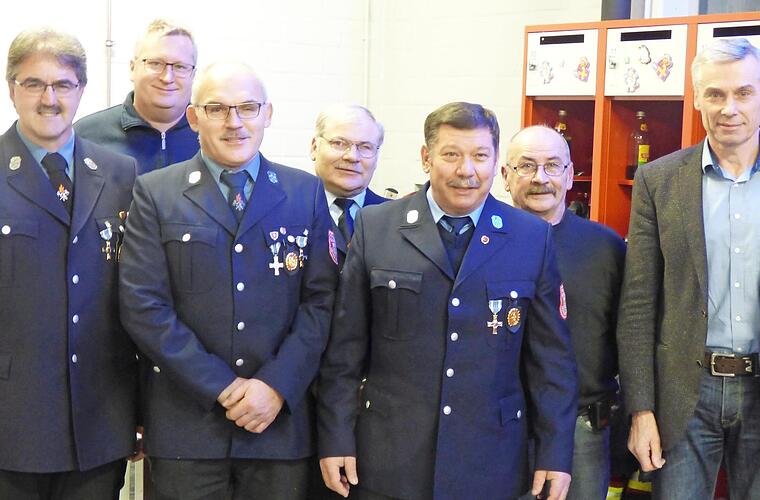 Hubert Dorsch und die anwesenden Kommandanten bedankten sich bei den Feuerwehrleuten für das vorbildliche Engagement in diesem für die Allgemeinheit so wichtigen Ehrenamt. red