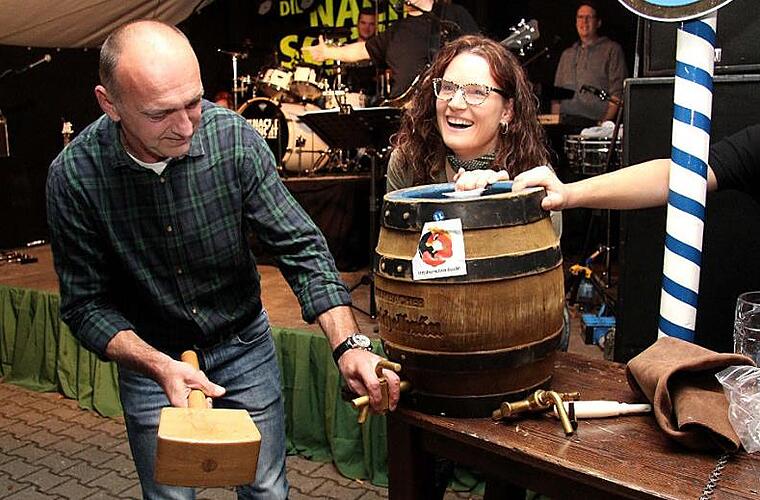 Bei der Bucher Kerwa war es in diesem Jahr ein Bieranstich mit Hindernissen: Der Zapfhahn passte nicht ins Fass und der Schlagzeuger von der Partyband "Die Nachtschicht" musste seinen Trommelwirbel dreimal abbrechen. Bürgermeister Heinrich Süß (UWG) bemühte sich redlich, das Fass anzustechen. "Alles zurück auf null, wir tun so, als wäre nichts gewesen", rief Bandleader Hans-Jürgen Lorenz ins Mikrofon, als auch beim zweiten Versuch kein Bier lief. Erst nach dem Anstich eines neuen Bierfasses konnte der Bürgermeister verkünden: "O'zapft is", und die sehnsüchtig wartenden Ortsburschen und -madla konnten ihre Krüge füllen.