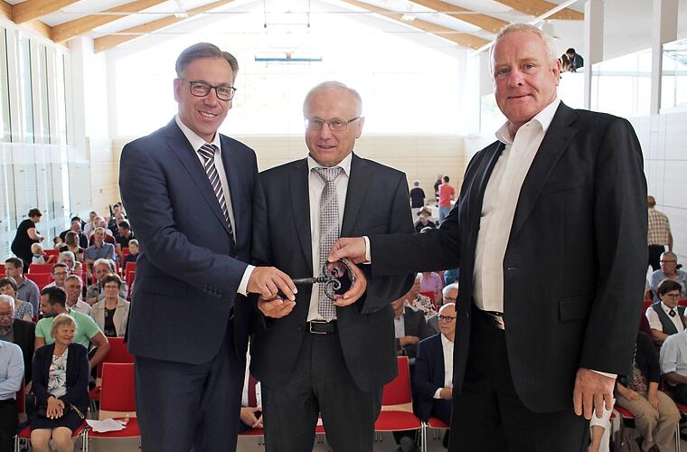 Landrat Alexander Tritthart gratulierte im Namen aller Gäste aus der Politik zu diesem "wunderbaren Gebäude". Dass dies nicht nur in großen Städten, sondern auch in der ländlichen Region des Landkreises möglich sei, erfülle ihn mit Freude und Stolz. "Nur weil wir starke Wirtschaftsunternehmen haben, können wir solche Investitionen schultern." In diesem Zusammenhang sei erwähnt, dass Adolf Wedel, Martin-Bauer-Geschäftsführer und Ehrenbürger von Vestenbergsgreuth, nach den Worten des Bürgermeisters "100 000 Euro mitgebracht hat". Die Halle habe auch an die Planer besondere Herausforderungen gestellt, sagte Architekt Erich Popp. Material und Ausgestaltung sollten über einen reinen Zweckbau hinausgehen. Der Bau sollte - neben dem Sportbereich - auch als Veranstaltungshalle konzipiert werden und damit "Aufenthaltsqualität" haben.