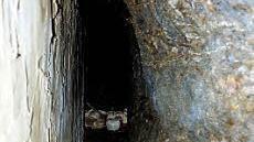 Der Blick unter dem gewölbten Torbogen aus massiven Steinen hindurch ins Innere des langgezogenen Raumes offenbart einen ungewöhnlichen Anblick. Linksseitig ist ein Raum innerhalb des Raumes. Dort waren die Tanks untergebracht. Eine Backsteinwand begrenzt diese Fläche. Doch an der rechten Seitenwand ist noch nicht Schluss. Ein schmaler Spalt führt zwischen dem Gemäuer und dem Fels hindurch. Wie weit? Selbst Behrschmidt kann das nicht sagen. Der Blitz des Fotoapparats bringt etwas Licht ins Dunkel. Nach geschätzten zehn Metern scheint eine Rückwand aufzutauchen.