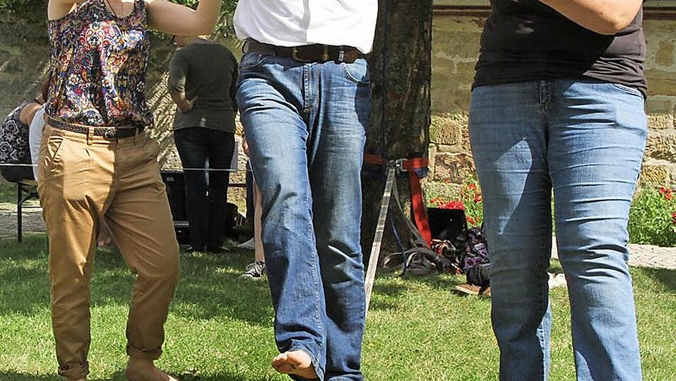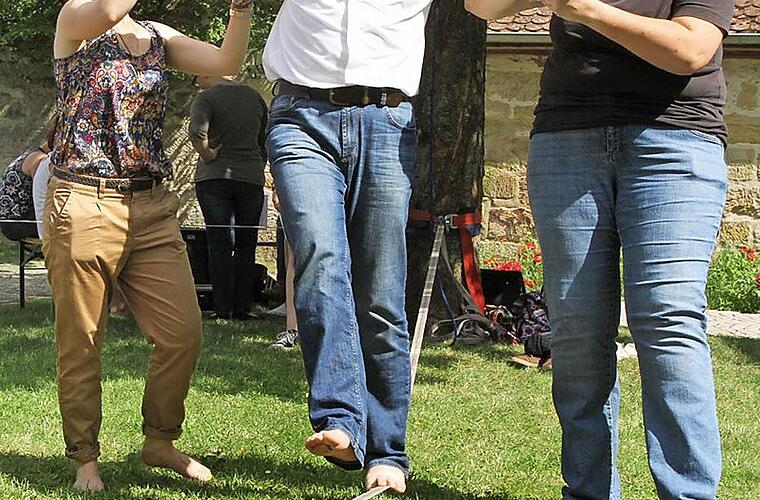 Es wurden verschiedene Workshops angeboten, darunter ein Fotokurs, das Basteln mit Naturmaterialien, Spiegelmosaike erstellen oder eigene Musikstücke komponieren mit Glaubensreferent Tobias Lübbers. Auf der Slackline im Rathausinnenhof konnte man Balance, Konzentration und Koordination üben. Das musste auch Pfarrer Matthias Steffel ausprobieren, flugs war er seiner Schuhe und Strümpfe entledigt und gab beim Balaceakt auf dem dünnen Schlauchband gar keine schlechte Figur ab.